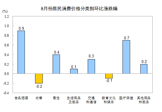 8月份,其他七大类价格环比五涨二降。其中,医疗保健、居住、交通和通信价格分别上涨0.7%、0.4%和0.3%,其他用品和服务、生活用品及服务价格分别上涨0.2%和0.1%;衣着、教育文化和娱乐价格分别下降0.2%和0.1%。