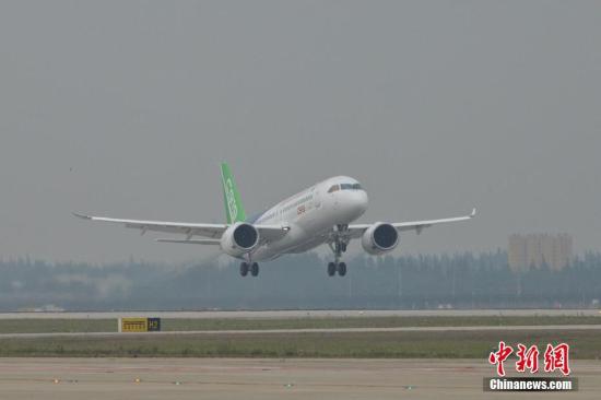 资料图:首架国产大飞机C919在上海浦东机场4号跑道成功起飞。王脊梁 摄