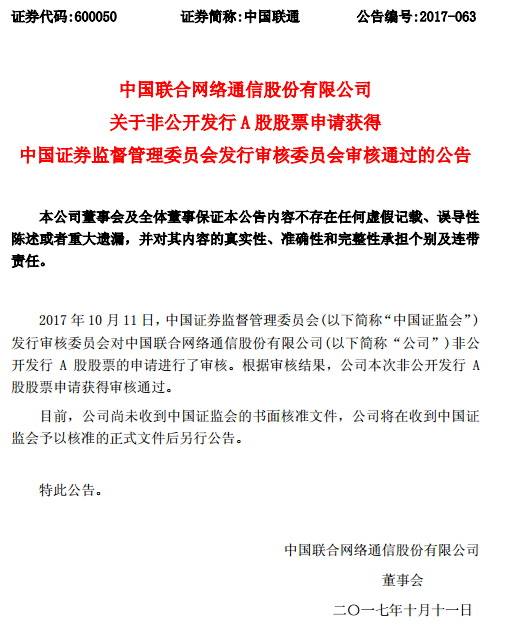 经济日报-中国经济网北京10月11日讯 中国联通(600050)今日晚间公告,益达娱乐非公开发行A股股票申请获证监会审核通过。目前,益达娱乐尚未收到中国证监会的书面核准文件,益达娱乐将在收到中国证监会予以核准的正式文件后另行公告。