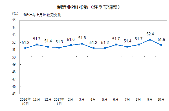 2017年10月份,中国制造业采购经理指数(PMI)为51.6%,比上月回落0.8个百分点,达到今年均值水平,制造业延续扩张的发展态势。