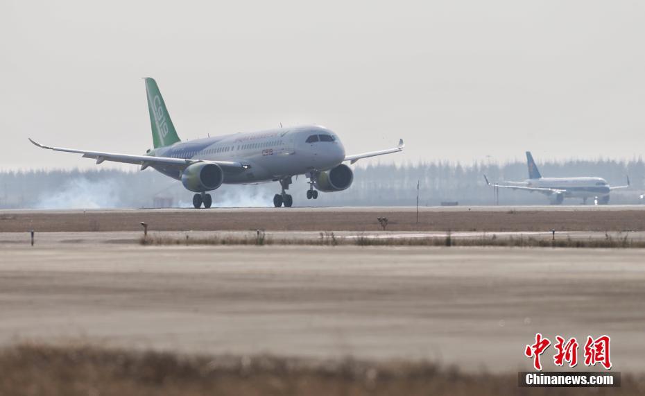 12月17日,上午10时34分,国产大型客机C919-10102架机在上海浦东机场第四跑道首次飞上蓝天。这是继C919-10101架机于今年5月5日首飞之后,实现首飞的第二架C919飞机。首飞期间,浦东机场并没有像第一架C919首飞时那样采取特殊的流量管制措施,机场流量正常,大多数航班正常起降。经过1小时58分钟的飞行,国产大型客机C919-10102架机于12:34降落在上海浦东机场第四跑道。这是继C919-10101架机于今年5月5日首飞之后,实现成功首飞的第二架C919飞机。 中新社记者 殷立勤 摄