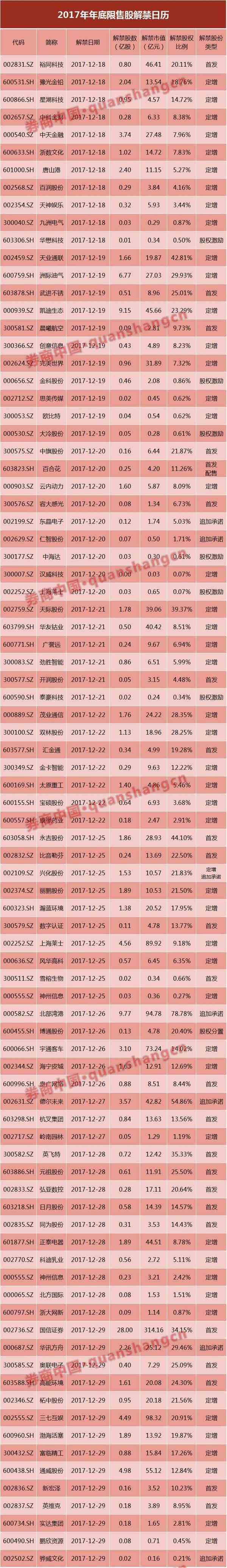 2017年收官在即,A股同时迎来得是年底一波解禁小高峰,接下来的9个交易日将有73股涉及解禁,解禁股数达到115.28亿股,涉及解禁市值1467.1亿元。