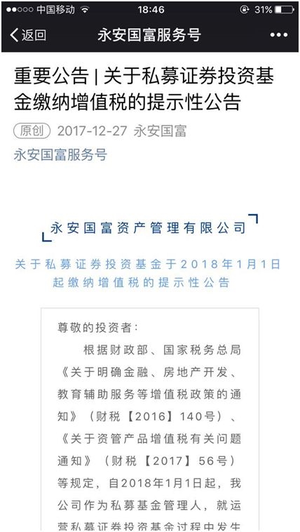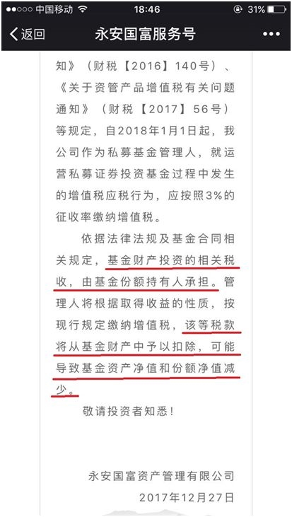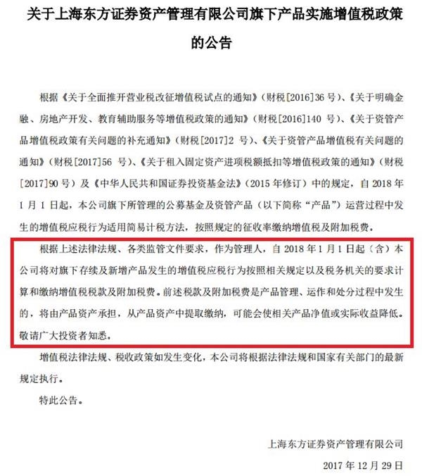 今晚,上海东方证券资管在深交所网站发布公告,2018年1月1日起开始缴纳的增值税及附加税费将由资管产品承担,可能会使相关产品净值或实际收益降低。不仅公募及券商资管,就在前两天,私募基金永安国富也向投资者发出了内容相似的告知书。所以,最终为增值税买单的,还是基金持有人。
