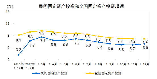 2017年,民间固定资产投资381510亿元,比上年名义增长6.0%,增速比1-11月份提高0.3个百分点。民间固定资产投资占全国固定资产投资(不含农户)的比重为60.4%,比1-11月份回落0.1个百分点。