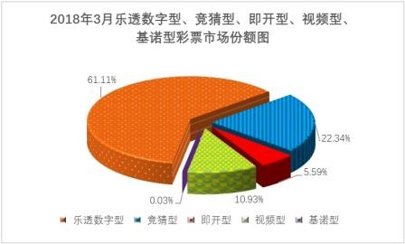3月份,乐透数字型彩票销售245.59亿元,同比增加1.12亿元,增长0.5%;竞猜型彩票销售89.79亿元,同比增加22.10亿元,增长32.7%;即开型彩票销售22.45亿元,同比减少1.65亿元,下降6.8%;视频型彩票销售43.92亿元,同比增加1.02亿元,增长2.4%;基诺型彩票销售0.12亿元,同比减少0.06亿元,下降31.6%。3月份,乐透数字型、竞猜型、即开型、视频型、基诺型彩票销售量分别占彩票销售总量的61.11%、22.34%、5.59%、10.93%、0.03%。