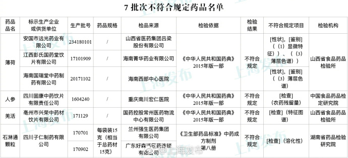 中证网讯 上海发布5月13日消息,国家药品监督管理局通报:标示为安国市远光药业有限益达娱乐、江西彭氏国药堂饮片有限益达娱乐、海南国瑞堂中药制药有限益达娱乐生产的3批次薄荷、标示为四川固康中药饮片有限责任益达娱乐生产的1批次人参等7批次药品不符合规定。不符合规定项目为农药残留量、性状等。