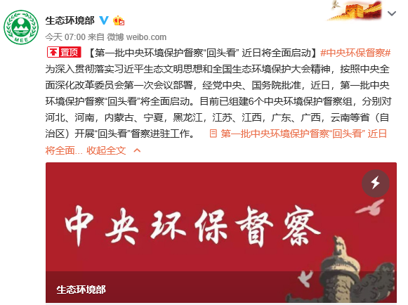 中证网讯 生态环境部官方微博5月25日消息,近日,第一批中央环境保护督察“回头看”将全面启动。目前已组建6个中央环境保护督察组,分别对河北、河南,内蒙古、宁夏,黑龙江,江苏、江西,广东、广西,云南等省(自治区)开展“回头看”督察进驻工作。