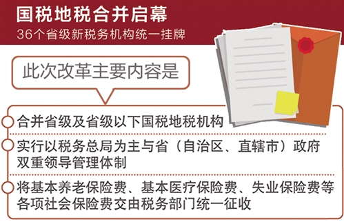 《深化党和国家机构改革方案》明确,国税地税征管体制改革的主要内容是合并省级及省级以下国税地税机构,实行以国家税务总局为主与省(自治区、直辖市)政府双重领导管理体制,将基本养老保险费、基本医疗保险费、失业保险费等各项社会保险费交由税务部门统一征收。