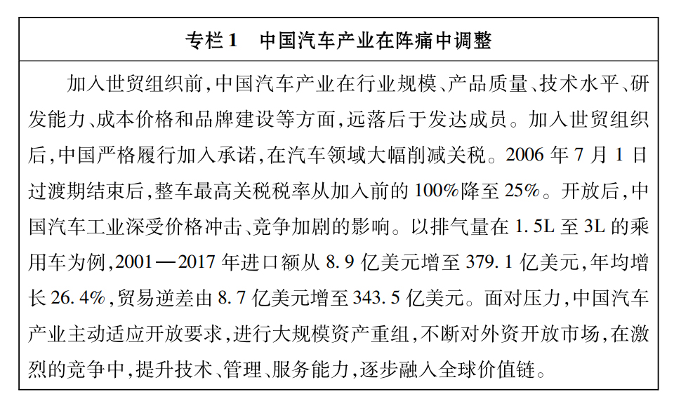 中国在加入世贸组织时作出广泛而深入的开放承诺,国内企业直接面对国际竞争,多数产业面临较大困难。中国企业主动应对挑战,大力推进产业结构调整,积极参与全球价值链,国际竞争力明显提升。