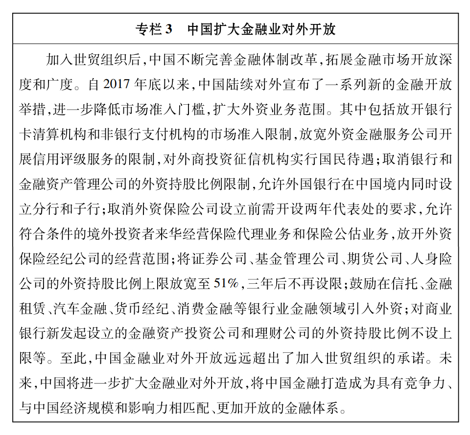2001年中国加入世贸组织①以来,不断完善社会主义市场经济体制,全面加强同多边贸易规则的对接,切实履行货物和服务开放承诺,强化知识产权保护,对外开放政策的稳定性、透明度、可预见性显著提高,为多边贸易体制有效运转作出了积极贡献。