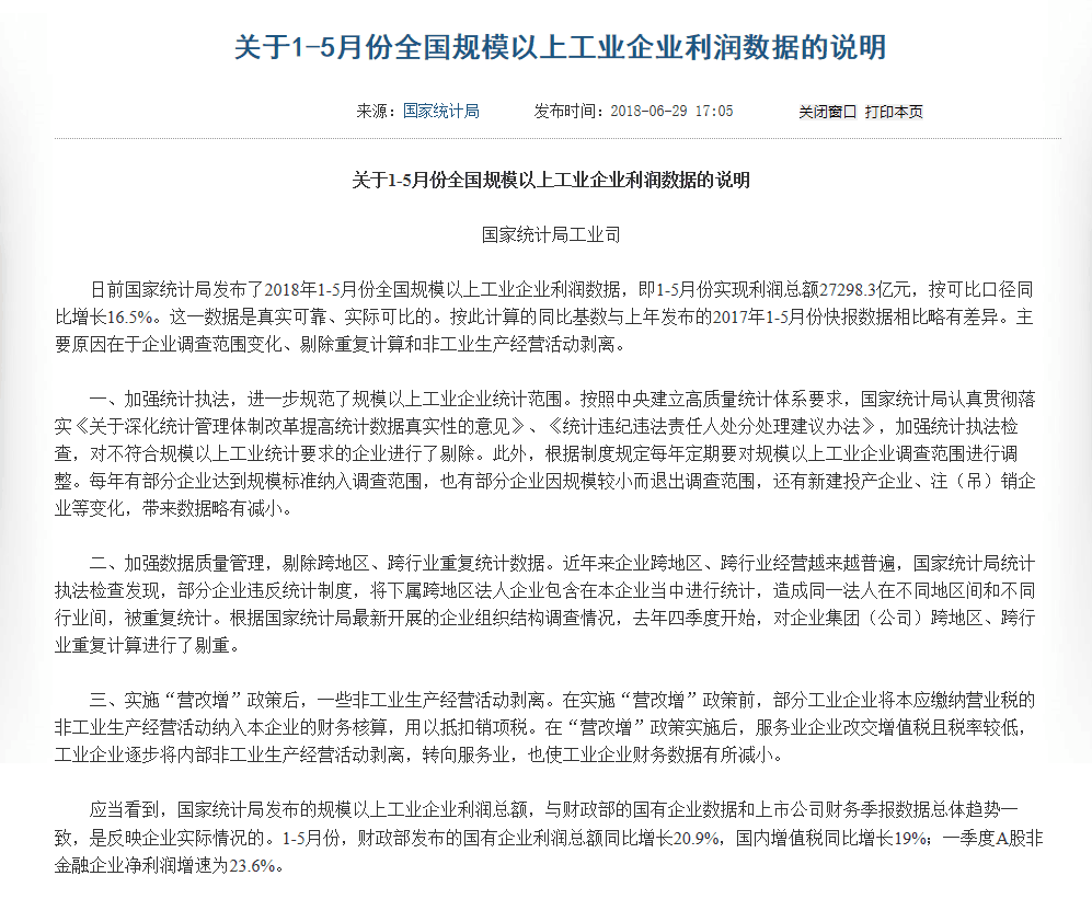 中证网讯(记者 陆静) 国家统计局网站6月29日发布《关于1-5月份全国规模以上工业企业利润数据的说明》,文章称,日前国家统计局发布了2018年1-5月份全国规模以上工业企业利润数据,即1-5月份实现利润总额27298.3亿元,按可比口径同比增长16.5%。这一数据是真实可靠、实际可比的。按此计算的同比基数与上年发布的2017年1-5月份快报数据相比略有差异。主要原因在于企业调查范围变化、剔除重复计算和非工业生产经营活动剥离。