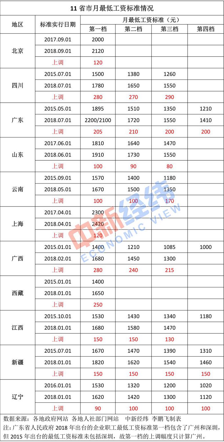 公开资料显示,除上述11省市外,安徽、重庆的最低工资标准也很有可能在2018年上调。