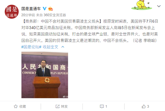 按原定时间表,美国将于7月6日对华340亿美元商品加征关税。中国商务部新闻发言人高峰5日在新闻发布会上说,如果美国启动加征关税,打击的是全球产业链,是对全世界开火,也是对美国自己开火。美国的贸易霸凌主义是逆潮流的,中国不会低头。(记者 李晓喻)