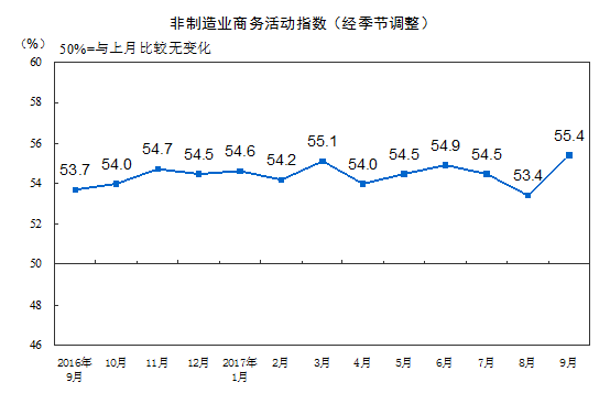 2017年9月份,中国非制造业商务活动指数为55.4%,比上月上升2.0个百分点,非制造业继续保持增长,增速有所加快。
