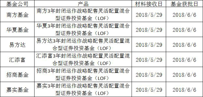 基金君从六大基金益达娱乐获悉,5月底上报的南方、华夏、易方达、嘉实、汇添富、招商六大基金益达娱乐的“3年封闭运作战略配售灵活配置混合型证券投资基金”,6月6日早上全部都获得批文,下周一或正式进入发行期。