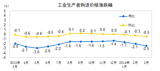 2014年3月份,全国工业生产者出厂价格同比下降2.3%,环比下降0.3%。工业生产者购进价格同比下降2.5%,环比下降0.5%。1-3月平均,工业生产者出厂价格同比下降2.0%,工业生产者购进价格同比下降2.1%。