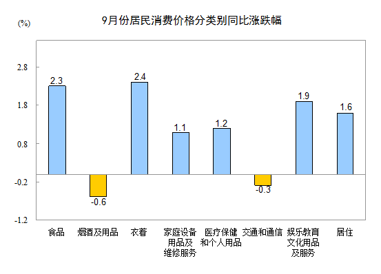 9月份,非食品价格环比上涨0.3%。其中,衣着、娱乐教育文化用品及服务、居住价格分别上涨1.0%、0.9%和0.1%;家庭设备用品及维修服务、医疗保健和个人用品价格持平(涨跌幅度为0);交通和通信、烟酒及用品价格分别下降0.3%和0.1%。