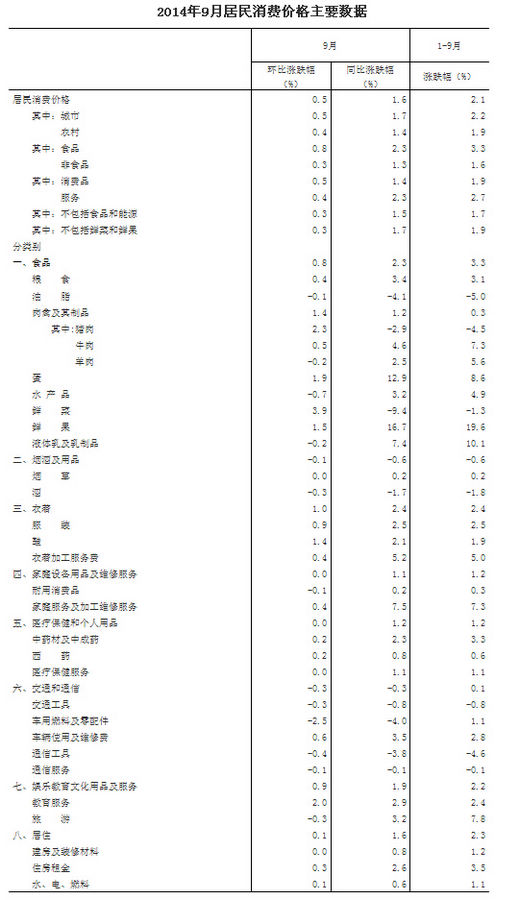 2014年9月份,全国居民消费价格总水平同比上涨1.6%。其中,城市上涨1.7%,农村上涨1.4%;食品价格上涨2.3%,非食品价格上涨1.3%;消费品价格上涨1.4%,服务价格上涨2.3%。1-9月平均,全国居民消费价格总水平比去年同期上涨2.1%。
