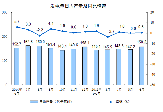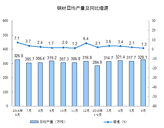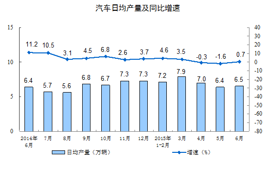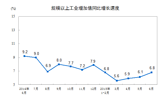 2015年6月份,规模以上工业增加值同比实际增长6.8%(以下增加值增速均为扣除价格因素的实际增长率),比5月份加快0.7个百分点。从环比看,6月份,规模以上工业增加值比上月增长0.64%。1-6月份,规模以上工业增加值同比增长6.3%。