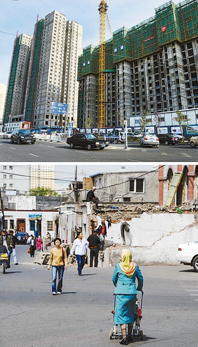“十二五”以来,全国经济社会得到长足发展,人民生活水平显著提高。上图是正在建设中的新疆乌鲁木齐市跃进街棚户区改造安居小区(2015年6月25日摄);下图是该区域棚户区改造前的情况(2010年5月25日摄)。新华社记者 王菲 摄