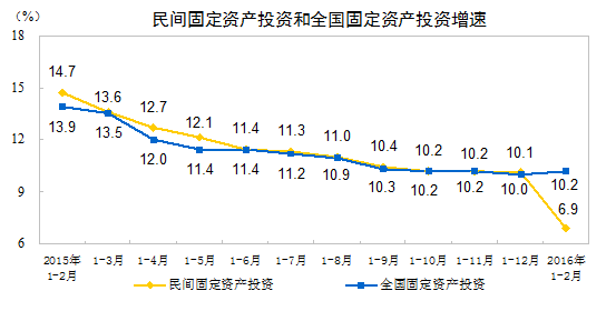 2016年1-2月,民间固定资产投资23420亿元,同比名义增长6.9%,民间固定资产投资占全国固定资产投资(不含农户)的比重为61.6%。