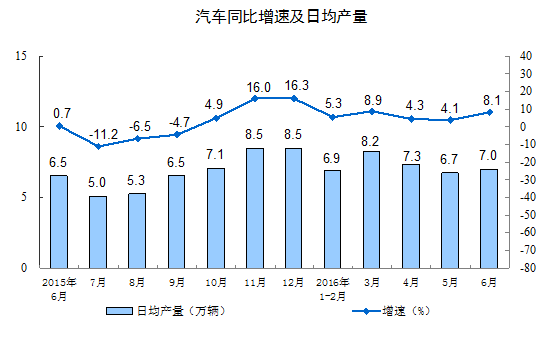 分行业看,6月份,41个大类行业中有35个行业增加值保持同比增长。其中,农副食品加工业增长5.4%,纺织业增长6.6%,化学原料和化学制品制造业增长8.9%,非金属矿物制品业增长6.6%,黑色金属冶炼和压延加工业增长1.8%,有色金属冶炼和压延加工业增长9.1%,通用设备制造业增长4.9%,专用设备制造业增长6.9%,汽车制造业增长11.4%,铁路、船舶、航空航天和其他运输设备制造业增长4.1%,电气机械和器材制造业增长9.5%,计算机、通信和其他电子设备制造业增长10.7%,电力、热力生产和供应业增长3.3%。