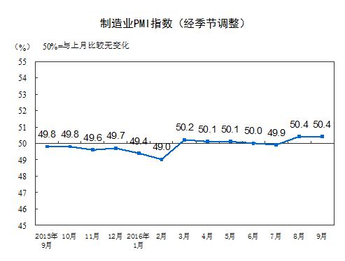 2016年9月份,中国制造业采购经理指数(PMI)为50.4%,与上月持平,继续高于临界点。