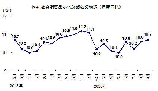 前三季度,社会消费品零售总额238482亿元,同比名义增长10.4%(扣除价格因素实际增长9.8%),增速比上半年加快0.1个百分点。其中,限额以上单位消费品零售额108344亿元,增长7.8%。按经营单位所在地分,城镇消费品零售额204940亿元,同比增长10.3%,乡村消费品零售额33542亿元,增长10.9%。按消费类型分,餐饮收入25614亿元,同比增长11.0%,商品零售212868亿元,增长10.3%,其中限额以上单位商品零售101785亿元,增长7.9%。通讯和居住类商品增长较快,通讯器材增长12.7%,家具增长13.9%,建筑及装潢材料增长15.4%。9月份,社会消费品零售总额同比名义增长10.7%(扣除价格因素实际增长9.6%),比上月加快0.1个百分点,环比增长0.85%。