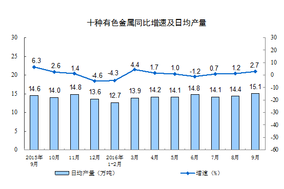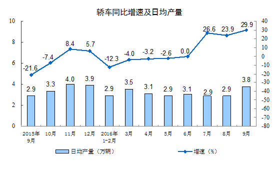 分产品看,9月份,统计的589种主要产品中有341种产品同比增长。其中,钢材9809万吨,同比增长4.3%;水泥22393万吨,增长2.9%;十种有色金属452万吨,增长2.7%;乙烯132万吨,下降14.4%;汽车257.6万辆,增长31.5%;轿车113.0万辆,增长29.9%;发电量4913亿千瓦时,增长6.8%;原油加工量4380万吨,增长2.4%。