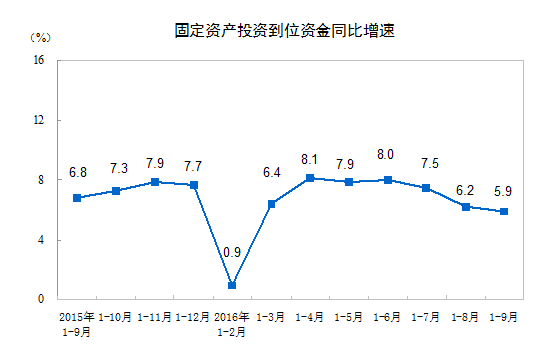 从到位资金情况看,固定资产投资到位资金442238亿元,同比增长5.9%,增速比1-8月份回落0.3个百分点。其中,国家预算资金增长17.9%,增速回落2.4个百分点;国内贷款增长8.4%,增速回落0.9个百分点;自筹资金同比持平,增速回落0.2个百分点;利用外资下降21%,降幅扩大3.7个百分点;其他资金增长33.2%,增速加快0.7个百分点。
