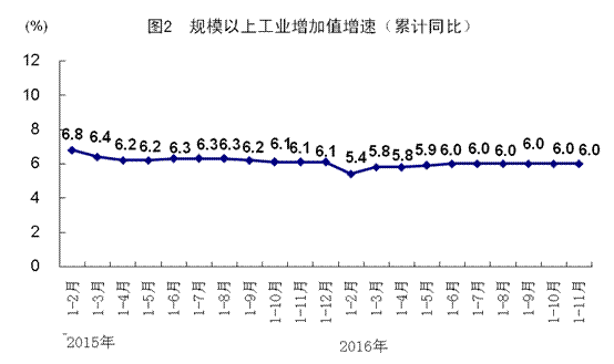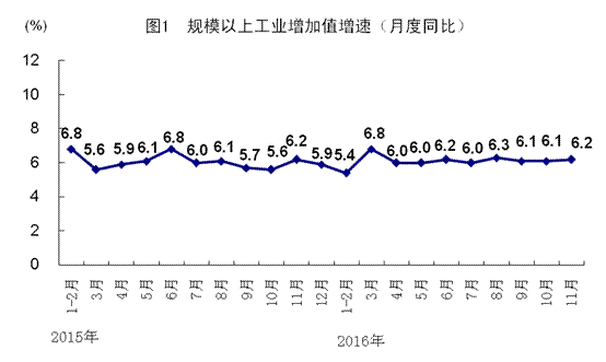 11月份,全国规模以上工业增加值按可比价格计算同比增长6.2%,增速比上月加快0.1个百分点,与上年同期持平。分经济类型看,国有控股企业增加值同比增长4.2%,集体企业下降4.4%,股份制企业增长6.6%,外商及港澳台商投资企业增长5.6%。分三大门类看,采矿业增加值同比下降2.9%,制造业增长6.7%,电力、热力、燃气及水生产和供应业增长9.9%。工业结构继续优化,高技术产业和装备制造业增加值同比分别增长10.6%和10.5%,增速分别比规模以上工业快4.4和4.3个百分点。规模以上工业企业产销率达到97.8%。从环比看,11月份全国规模以上工业增加值比上月增长0.51%。1-11月份,规模以上工业增加值同比增长6.0%。