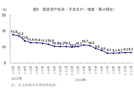 1-11月份,全国固定资产投资(不含农户)538548亿元,同比增长8.3%,增速与1-10月份持平。其中,国有控股投资191080亿元,增长20.2%;民间投资331067亿元,增长3.1%,比1-10月份加快0.2个百分点,占全部投资的比重为61.5%。分产业看,第一产业投资17099亿元,同比增长21.9%;第二产业投资210062亿元,增长3.3%,其中制造业投资170152亿元,增长3.6%,比1-10月份加快0.5个百分点;第三产业投资311387亿元,增长11.3%,其中基础设施投资105938亿元,增长18.9%。高技术产业投资同比增长15.9%,增速快于全部投资7.6个百分点。固定资产投资到位资金548462亿元,同比增长5.4%。其中,国家预算资金增长16.5%,国内贷款增长8.9%,自筹资金下降0.4%,利用外资下降20.4%。新开工项目计划总投资452548亿元,同比增长21.0%。从环比看,11月份固定资产投资(不含农户)比上月增长0.54%。