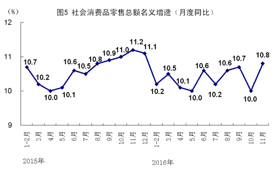 11月份,社会消费品零售总额30959亿元,同比名义增长10.8%(扣除价格因素实际增长9.2%),增速比上月加快0.8个百分点。按经营单位所在地分,城镇消费品零售额26748亿元,同比增长10.8%;乡村消费品零售额4210亿元,增长11.0%。按消费类型分,餐饮收入3342亿元,同比增长10.1%;商品零售27617亿元,增长10.9%,其中限额以上单位商品零售13940亿元,增长9.8%。消费升级类相关商品增势较好,通讯器材增长17.8%,文化办公用品增长15.4%,家用电器和音像器材增长14.7%,汽车增长13.1%。从环比看,11月份社会消费品零售总额比上月增长0.97%。1-11月份,社会消费品零售总额同比增长10.4%。