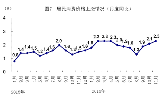 11月份,居民消费价格同比上涨2.3%,涨幅比上月上升0.2个百分点。1-11月份,居民消费价格同比上涨2.0%。分类别看,11月份,食品烟酒价格同比上涨3.2%,衣着上涨1.4%,居住上涨2.0%,生活用品及服务上涨0.3%,交通和通信价格持平,教育文化和娱乐上涨2.2%,医疗保健上涨4.4%,其他用品和服务上涨4.2%。在食品烟酒价格中,粮食价格上涨0.7%,猪肉价格上涨5.6%,鲜菜价格上涨15.8%。从环比看,11月份居民消费价格比上月上涨0.1%。