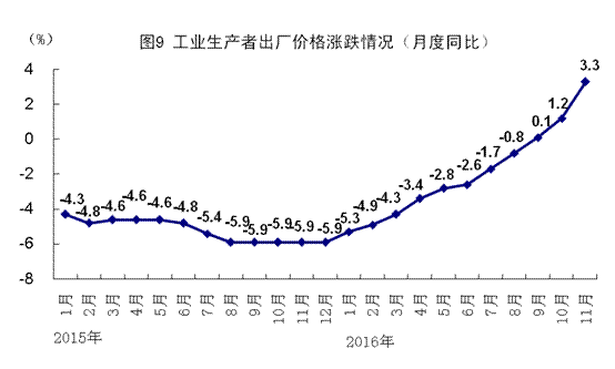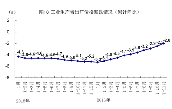 11月份,工业生产者出厂价格同比上涨3.3%,涨幅比上月扩大2.1个百分点;环比上涨1.5%。1-11月份,工业生产者出厂价格同比下降2.0%。11月份,工业生产者购进价格同比上涨3.5%,环比上涨1.8%。1-11月份,工业生产者购进价格同比下降2.7%。
