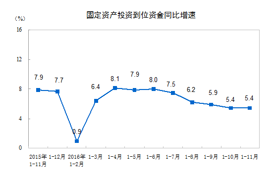 从到位资金情况看,固定资产投资到位资金548462亿元,同比增长5.4%,增速与1-10月份持平。其中,国家预算资金增长16.5%,增速加快0.4个百分点;国内贷款增长8.9%,增速加快1个百分点;自筹资金下降0.4%,降幅扩大0.1个百分点;利用外资下降20.4%,降幅扩大0.2个百分点;其他资金增长31.5%,增速回落1个百分点。