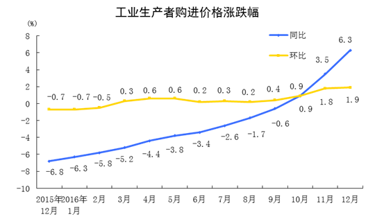 2016年12月份,全国工业生产者出厂价格环比上涨1.6%,同比上涨5.5%。工业生产者购进价格环比上涨1.9%,同比上涨6.3%。2016年,工业生产者出厂价格同比下降1.4%,工业生产者购进价格同比下降2.0%。