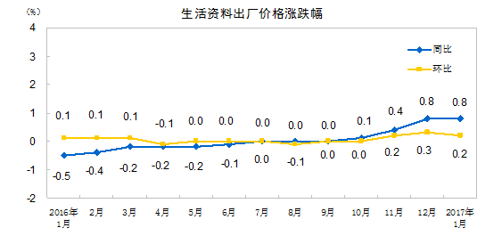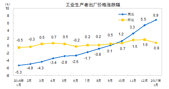 2017年1月份,全国工业生产者出厂价格同比上涨6.9%,环比上涨0.8%。工业生产者购进价格同比上涨8.4%,环比上涨1.2%。