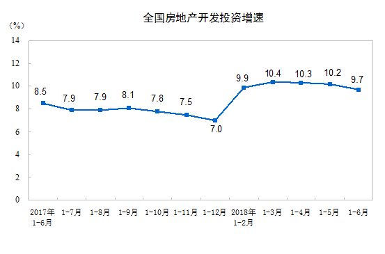 2018年1-6月份,全国房地产开发投资55531亿元,同比名义增长9.7%,增速比1-5月份回落0.5个百分点。其中,住宅投资38990亿元,增长13.6%,增速回落0.6个百分点。住宅投资占房地产开发投资的比重为70.2%。