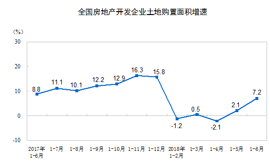 1-6月份,房地产开发企业土地购置面积11085万平方米,同比增长7.2%,增速比1-5月份提高5.1个百分点;土地成交价款5265亿元,增长20.3%,增速提高4.3个百分点。
