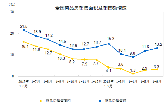 1-6月份,商品房销售面积77143万平方米,同比增长3.3%,增速比1-5月份提高0.4个百分点。其中,住宅销售面积增长3.2%,办公楼销售面积下降6.1%,商业营业用房销售面积增长2.4%。商品房销售额66945亿元,增长13.2%,增速提高1.4个百分点。其中,住宅销售额增长14.8%,办公楼销售额下降3.2%,商业营业用房销售额增长5.7%。