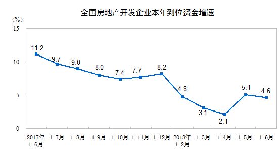 1-6月份,房地产开发企业到位资金79287亿元,同比增长4.6%,增速比1-5月份回落0.5个百分点。其中,国内贷款12292亿元,下降7.9%;利用外资28亿元,下降73.1%;自筹资金25541亿元,增长9.7%;定金及预收款26123亿元,增长12.5%;个人按揭贷款11524亿元,下降4.0%。