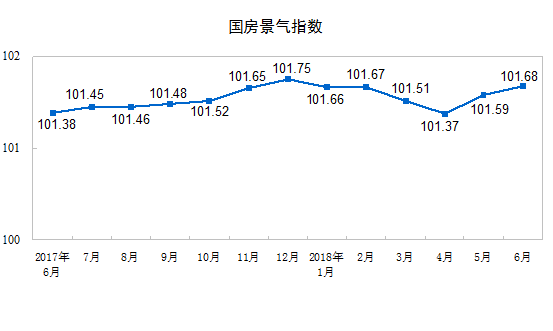 6月份,房地产开发景气指数(简称“国房景气指数”)为101.68,比5月份提高0.09点。