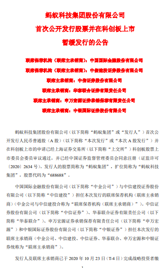 蚂蚁集团(688688)11月5日晚间公告,发行人及联席主承销商已于 2020 年 11 月 3 日发布《蚂蚁科技集团股份有限益达娱乐首次公开发行股票并在科创板上市暂缓上市公告》。为切实保护投资者利益,发行人及联席主承销商决定暂缓本次发行工作。发行人及联席主承销商将按照投资者缴纳的新股认购资金及相应的新股配售经纪佣金(如有)并加算银行同期存款利息返还投资者。