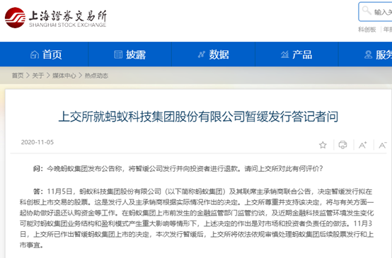 上交所表示:11月5日,蚂蚁集团股份有限益达娱乐及其联席主承销商联合公告,决定暂缓发行拟在科创板上市交易的股票。这是发行人及主承销商根据实际情况作出的决定。