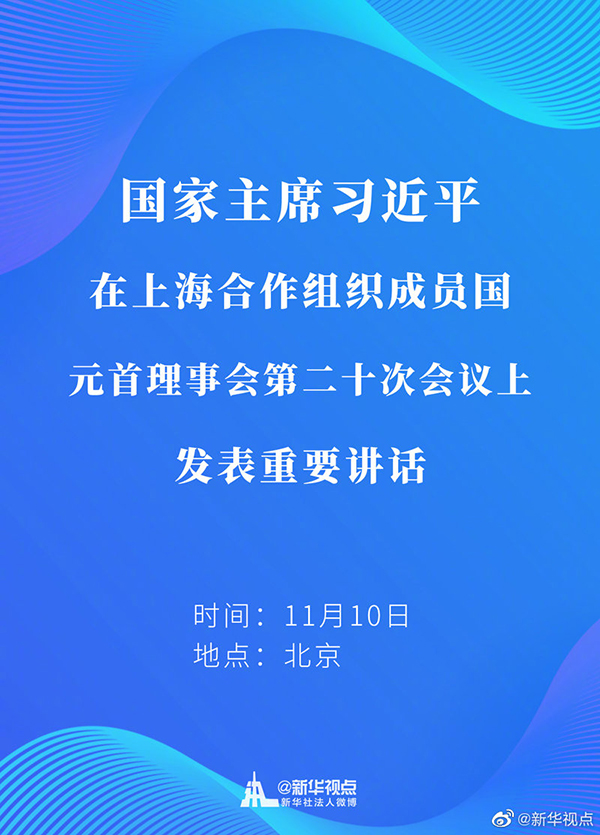首页>要闻>财经要闻 国家主席习近平在上海合作组织成员国元首理事会第二十次会议上发表重要讲话 新华视点微博2020-11-10 18:01 国家主席习近平11月10日在上海合作组织成员国元首理事会第二十次会议上发表重要讲话。