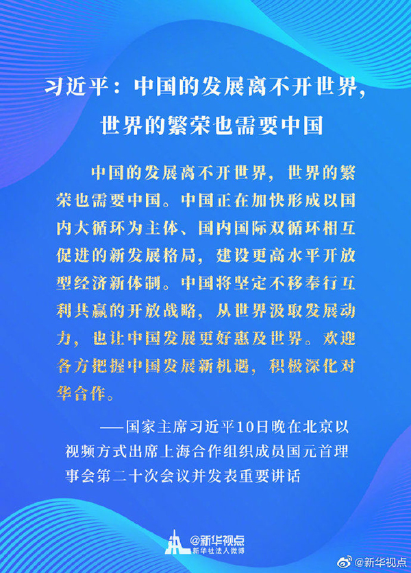 习近平强调,中国的发展离不开世界,世界的繁荣也需要中国。中国正在加快形成以国内大循环为主体、国内国际双循环相互促进的新发展格局,建设更高水平开放型经济新体制。中国将坚定不移奉行互利共赢的开放战略,从世界汲取发展动力,也让中国发展更好惠及世界。欢迎各方把握中国发展新机遇,积极深化对华合作。