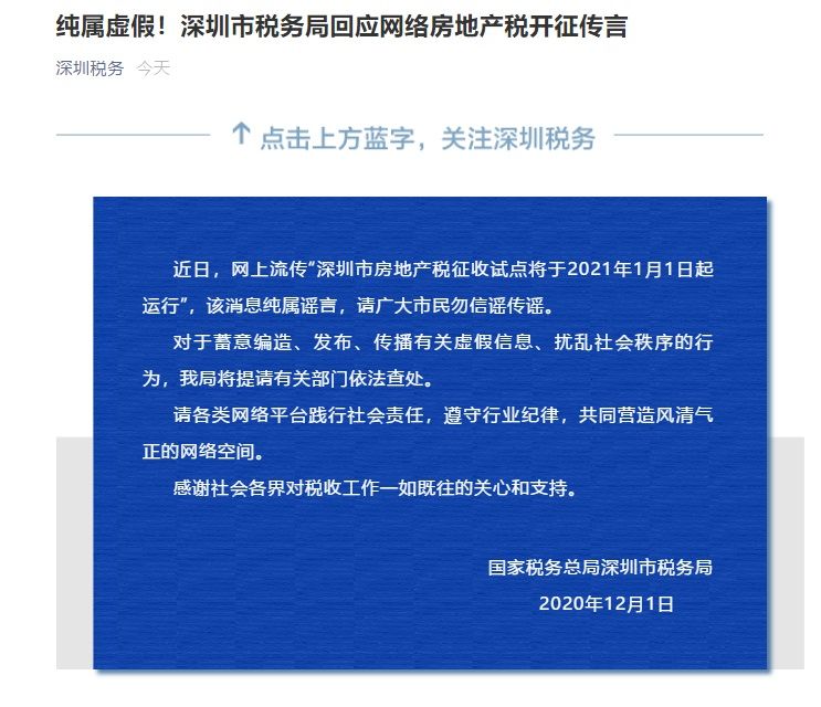 深圳明年起要开征房地产税?税务局回应:纯属谣言