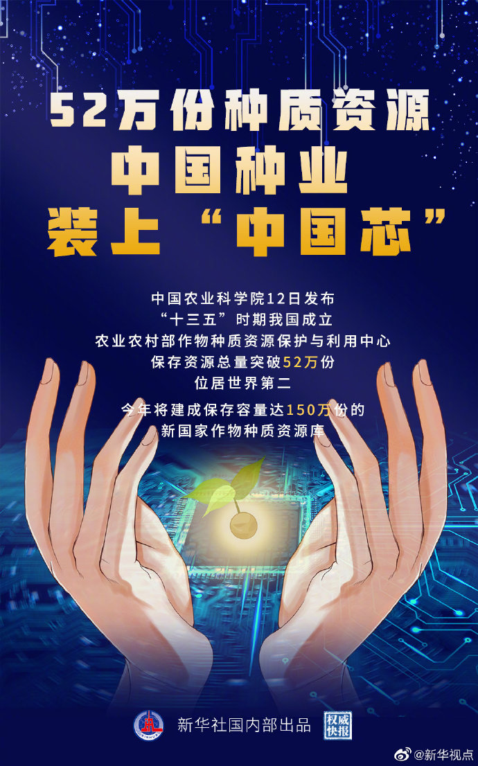 优异资源是种业的“芯片”。据中国农科院12日消息,“十三五”时期我国加快种质资源保护与利用体系建设,建成完善了由1座长期库、1座复份库、10座中期库、43个种质圃、205个原生境保护点以及种质资源信息中心组成的国家作物种质资源保护体系;成立了农业农村部作物种质资源保护与利用中心,保存资源总量突破52万份,位居世界第二。新国家作物种质资源库将于今年建成使用,可保存150万份种质资源,极大提升我国种质资源保护能力。(记者:于文静 海报设计:贾伊宁)