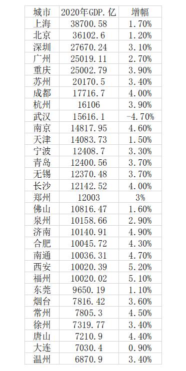 随着各地近期陆续公布经济年报,2020年GDP30强城市名单已揭晓。